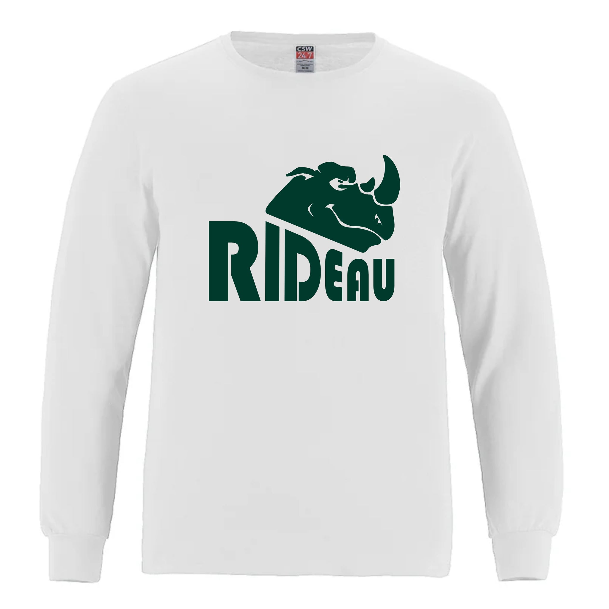Soft, white cotton long-sleeve tee with forest Rideau Rhino screenprint.